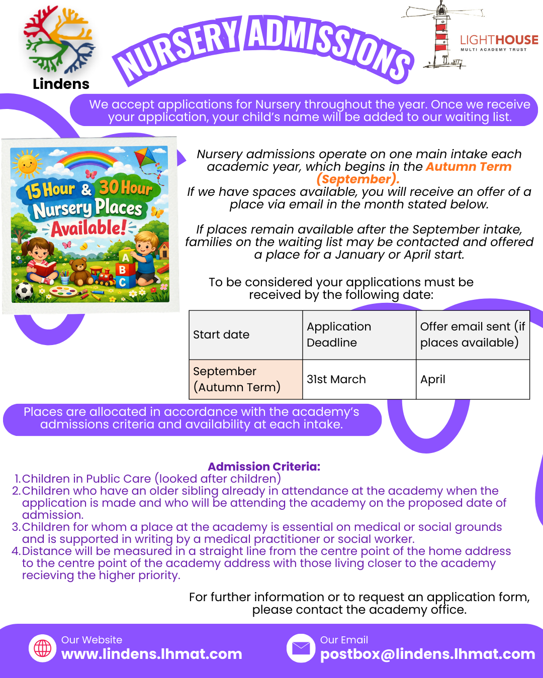 Lindens has a 52 place nursery. 26 AM places and 26 PM places. We offer 15 hour and 30 hour places.